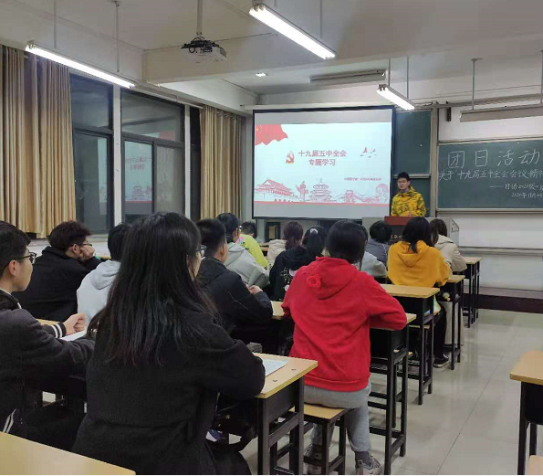 11月20日至11月27日,根据校团委相关通知,我院开展“深入学习宣传贯彻党的十九届五中全会精神”主题团日活动。我院各团支部充分动员团员,分别通过学习交流会、诵读会、征文演讲、集中观看视频、翻译学习内容等形式组织团员学习全会精神。