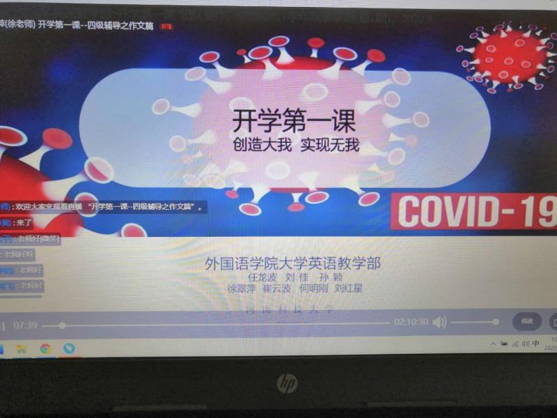 8月31日,开课第一天,老师们通过用英语介绍新冠疫情、中国抗疫,为英语语言的学习提供生动的实例。结合课堂思政,老师们讲述了抗疫过程中牺牲个人利益的各种感人事迹和其所体现的国家精神,讲述了迎难而上、做最美逆行者的英雄主义精神,将立德树人真正融入渗透到教育教学全过程。为适应金沙官网错峰开学的政策,老师们对部分尚未返校的学生积极开展线上教学活动,包括视频直播、录播、推送图片、音视频等材料,布置学习任务,确保完成教学任务。