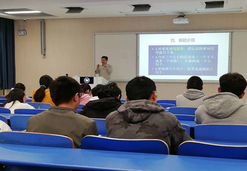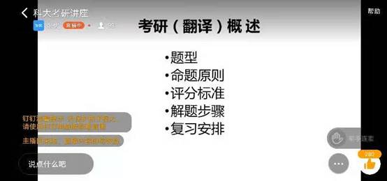 张优老师以“英译汉方法与技巧”为专题,首先讲述了考研英语翻译的题型、命题原则、评分标准、解题步骤和复习安排,然后结合实例分析了英译汉中词的处理和句子成分的处理, 并通过钉钉群分享考研英语翻译重点词组和句型的复习资料。张优老师的精彩讲座博得了台下和线上的学生阵阵掌声和赞许。