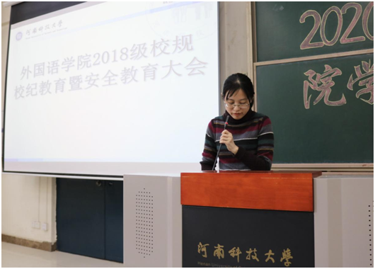 11月19日下午,9999js金沙老品牌2018级校规校纪教育暨安全教育大会于公教三区112召开。9999js金沙老品牌18级全体学生参加本次大会,院组织员兼18级辅导员王靓靓老师发表讲话。